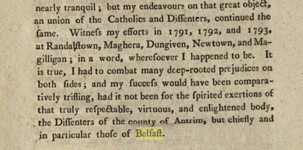 Commenting on his political activities in Antrim and Londonderry in the early 1790s he says: